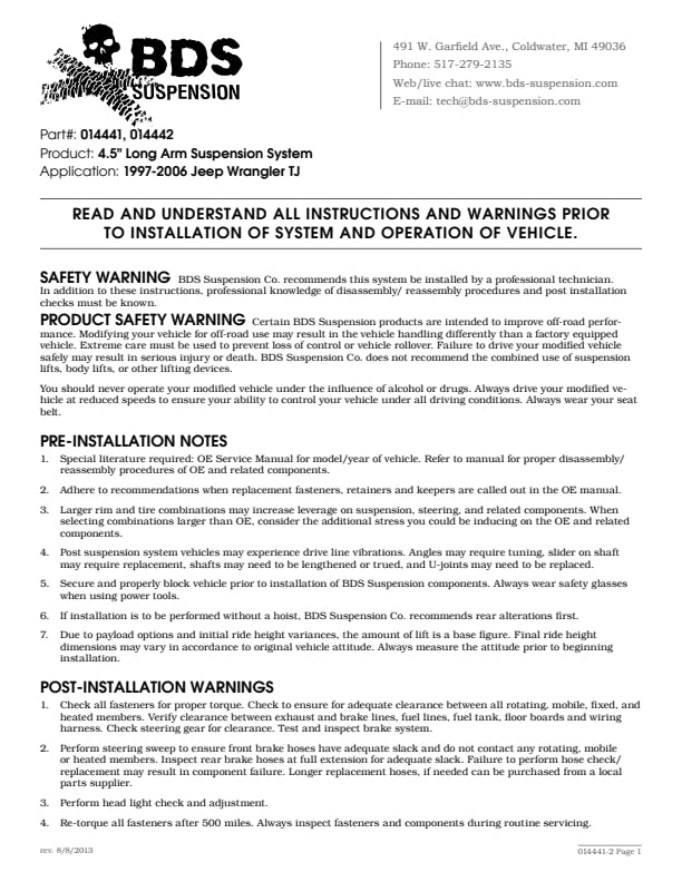 Maximize the capability of your 1996-2003 Jeep Wrangler TJ with this 4.5-inch lift kit with long arm conversion from BDS Suspension. Designed to improve stance this kit includes everything necessary to set your Jeep up right with clearance for up to 33" tires. By maximizing the length of both the upper and lower control arms, BDS has minimized caster change for optimal handling and minimized road forces. The control arm geometry is setup using new subframe braces that incorporates the link mounts and an optional belly pan.