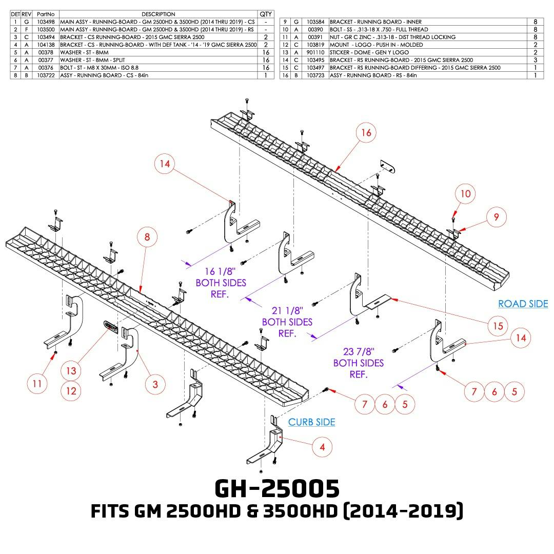 Enhance your GM 1500 (2019-2024) or GM 2500HD/3500HD (2020-2024) Crew Cab with durable steel running boards. Anti-slip, criss-cross design, 84" length, 400 lb. capacity, and black powder coat finish. Made in America for long-lasting strength.