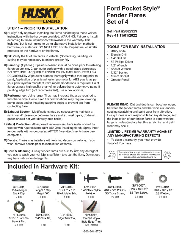 - Pocket Style Fender Flares are covered by Husky Liners Limited Lifetime Warranty, featuring Husky's legendary durability, so they're built to last. Proudly made in the USA with global materials.