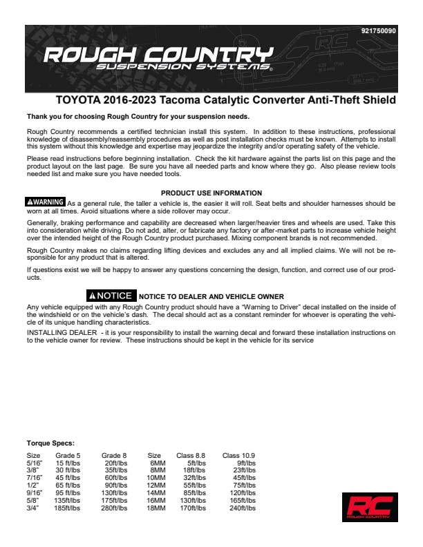 Are you tired of constantly worrying about the safety of your valuable catalytic converter while navigating through rough roads, speed bumps, and potential hazards? Look no further than Rough Country's Anti-Theft Skid Plate for the third-generation Tacoma, a game-changing solution designed to safeguard your vehicle's catalytic converter while providing unparalleled peace of mind. Crafted to tackle the challenges of the road head-on, our skid plate stands out from the rest thanks to its impressive range of unique features. Robust 14-Gauge Steel Construction: Crafted from heavy-duty 14-gauge steel, the Tacoma skid plate is built to withstand the test of time. Its remarkable durability ensures your investment is protected against impact, debris, and various road hazards, giving you the confidence to explore without limitations. Complete Catalytic Converter Protection: Our Tacoma Anti-Theft Skid Plate acts as a formidable shield for your catalytic converter, shielding it from potential damage caused by road debris, pesky speed bumps, and other unforeseen obstacles.Anti-Theft Design: Our skid plate not only provides physical protection but also deters theft attempts, effectively reducing the risk of losing your catalytic converter to would-be thieves. Powder-Coated Finish: The Tacoma Anti-Theft Skid Plate boasts a resilient powder-coated finish that adds an extra layer of defense against corrosion, ensuring that your investment remains pristine even in challenging weather conditions. Effortless Bolt-On Installation: We understand the importance of convenience, which is why our skid plate features an easy bolt-on installation process. With the Rough Country Anti-Theft Skid Plate, you'll never compromise your vehicle's safety and security again.